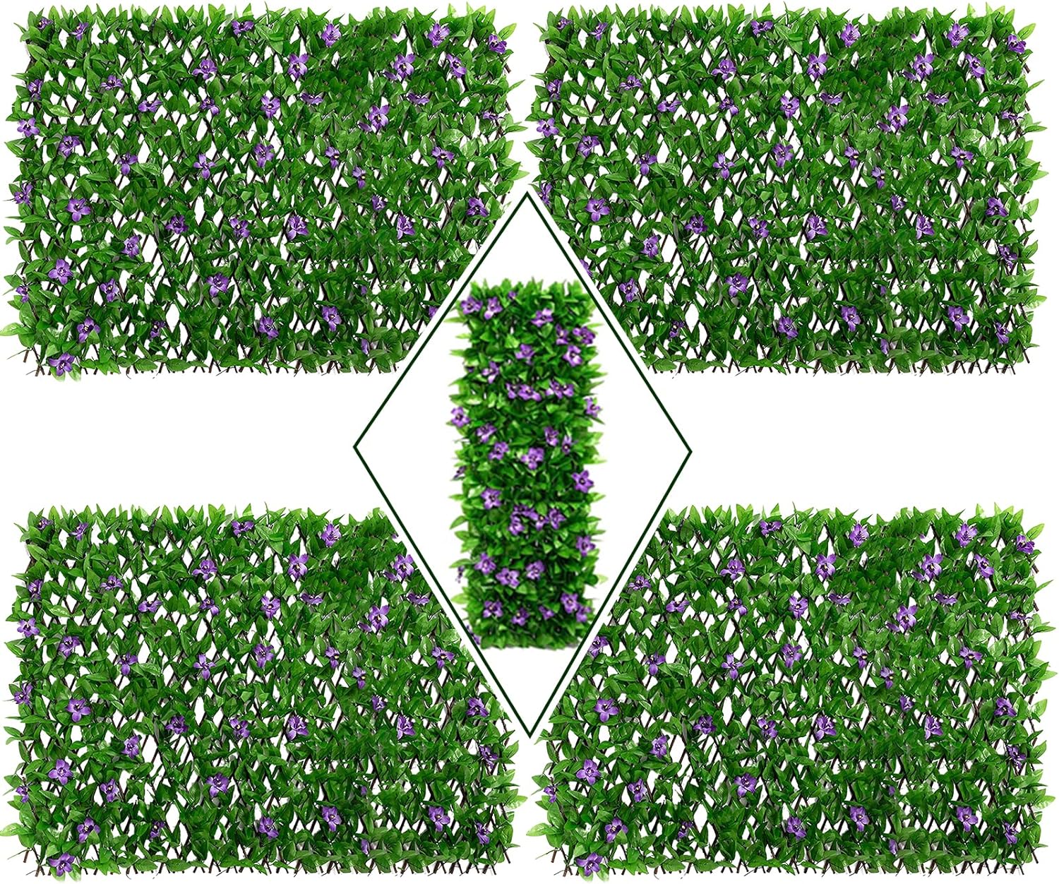 Expandable to create an instant privacy fence screen covered with faux ivy leaves. Flexible, expands or contracts to your desired dimensions and privacy, ideal for wedding decoration, outdoor landscaping design, greenery wall covering, garden fence, sound diffuser privacy hedge, balcony privacy screen and home décor