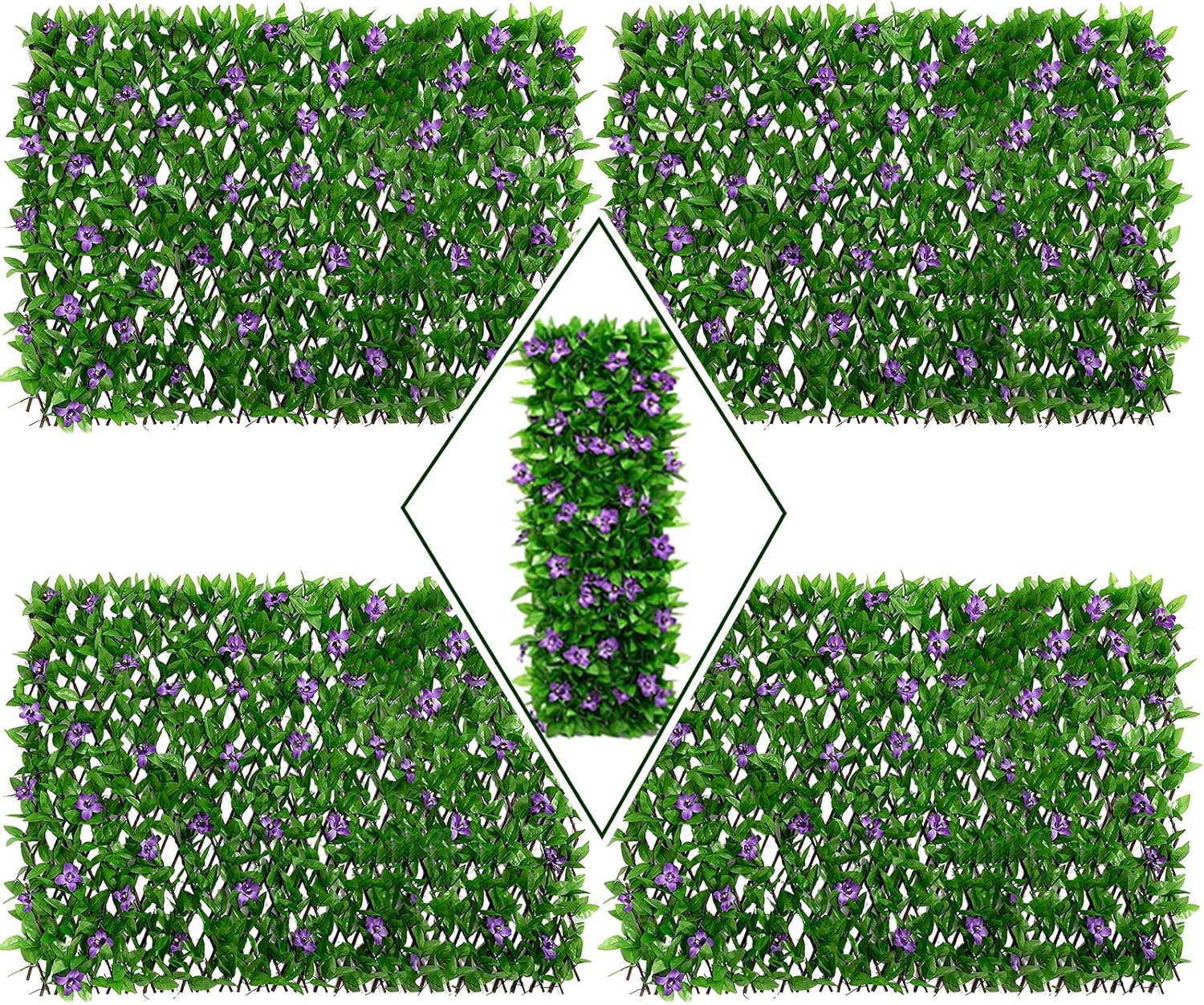 Expandable to create an instant privacy fence screen covered with faux ivy leaves. Flexible, expands or contracts to your desired dimensions and privacy, ideal for wedding decoration, outdoor landscaping design, greenery wall covering, garden fence, sound diffuser privacy hedge, balcony privacy screen and home décor